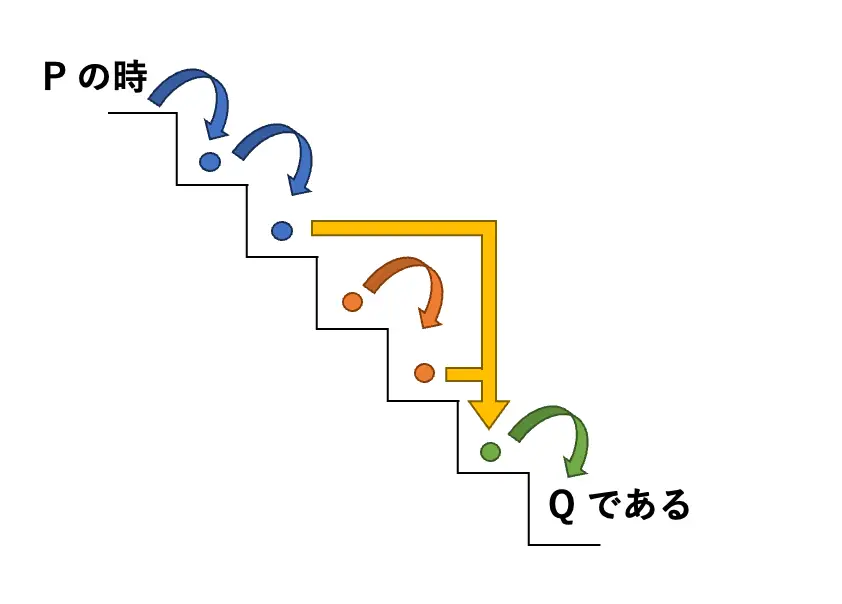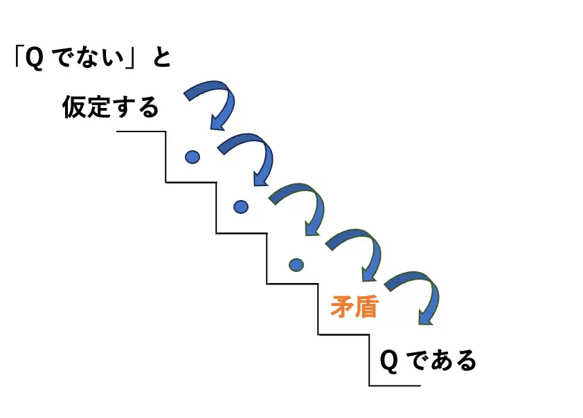 証明手順のいろは 未分類 2026.02.17 初めに 「証明のヒント」で 「ステップごとに証明を分解すると問題が解きやすいよ」と 言ってみたものの、どう解くと良いのか、どう分解しているのかが、 いまいち自分でも理解できていないので、うまく言語化できるか 試してみました。 私が好きな分野の私なりの証明手法なので、 すべての分野で通用するかどうかまでは分かりませんが、 「知っておくと、お得」と思います。 ・仮定と結論について ・前提条件について・証明における主だった3つのパターン ・直接法 ・待遇法 ・背理法 仮定と結論について 仮定とは、証明の出発点、よく「$p$」と置かれる。 結論とは、証明の終着点、よく「$q$」と置かれる。 証明とは、「$p \Rightarrow q$」までの一連の流れのこと。 ちなみに、大学の数学の授業では、「$p \Rightarrow q$」とは書かれていない。 文章で書かれている。 ゆえに、どこが仮定か、また結論か、知りたければ、 書かれている内容から、文節を丁寧に読み解く必要がある。 例えば、仮定であれば「$p$である時」とか、 「$p$ならば」とか、「$p$であれば」などと書かれている。 結論は、「$q$である」などと書かれている。 この時、「仮定がこれ」、「結論がこれ」、 と判明しさえすれば、あとはパズルの要領で 解くことができる。 個人的には、どこが仮定で、どこが結論かを 見定めることが、とても難しいと思う。 前提条件について 前提条件とは、ある定理が存在している時、 その定理が成り立つための条件のこと。 「○○である時」とか「これを条件として」とか 色々な書かれ方がなされるのだけれど、このことがないと その定理が成り立たない。 つまり、その前提条件は、ある定理を証明する際、 その証明の中のどこかで使用しなければ、その定理が成立しない ことを意味する。 証明における主だった3つのパターン 証明手法の種類について、自分自身でもいまいち 自信がなかったので、OpenAI(ChatGPT)で調べてみました。 証明における主だった3つのパターンとは、 直接法、対偶法、背理法というもの。 このほかに、数学的帰納法という証明手法があるそう。 これはこれで、独立した証明手法であるらしい。 この3つの証明手法+α(アルファ)が 主要な証明手法だとのこと。 直接法について 直接法とは、「$p \Rightarrow q$」を証明する時、 $p$ から$q$ までの間をコツコツと埋めていく方法。 イメージで言うならば、 階段を一段一段、降ろしていくイメージ。 一例ではあるのだけれど、 イメージとして描くと、こんな感じ。 具体的な解き方については、 こちら 対偶法について 対偶法とは、「$p \Rightarrow q$」を証明しようとする際、 仮定と結論を否定して、かつ、証明の流れを 逆向きに変える方法。 なんでそんなことをするのかというと、 前述の方法(直接法)で解くことが難しい時が あるから。 ちなみに、「$p$の否定」とは、「 $\neg p$ 」とか「 $\bar{p}$ 」 とか、 色々と書かれ方があるのだけれど、意味合いとしては 「$p$でない」ということ。 「$q$の否定」も、「 $\neg q$ 」 とか 「 $\bar{q}$ 」とか、 色々と書かれ方があるのだけれど、意味合いとしては 「$q$でない」ということ。 従って、「$p \Rightarrow q$」の時、 「$q$でない $\Rightarrow$ $p$でない」を証明すれば 「$p \Rightarrow q$」を証明したことになる。 個人的な覚え方としては、 「否定して、否定して、ひっくり返す」 また、証明の流れに関しては、直接法も 対偶法も同じ。 証明の流れに関して、一例ではあるのだけれど、 イメージとして描くと、こんな感じ。 背理法について 背理法とは、結論を否定して矛盾を導く方法。 ということは、証明するより先に 「結論を否定すると、どこかで矛盾していそうだな」 と思わないといけない。 つまり、論をこねた少し先を推理するわけで、 そのことが比較的難しい。 証明の流れに関しては、こんなイメージ。