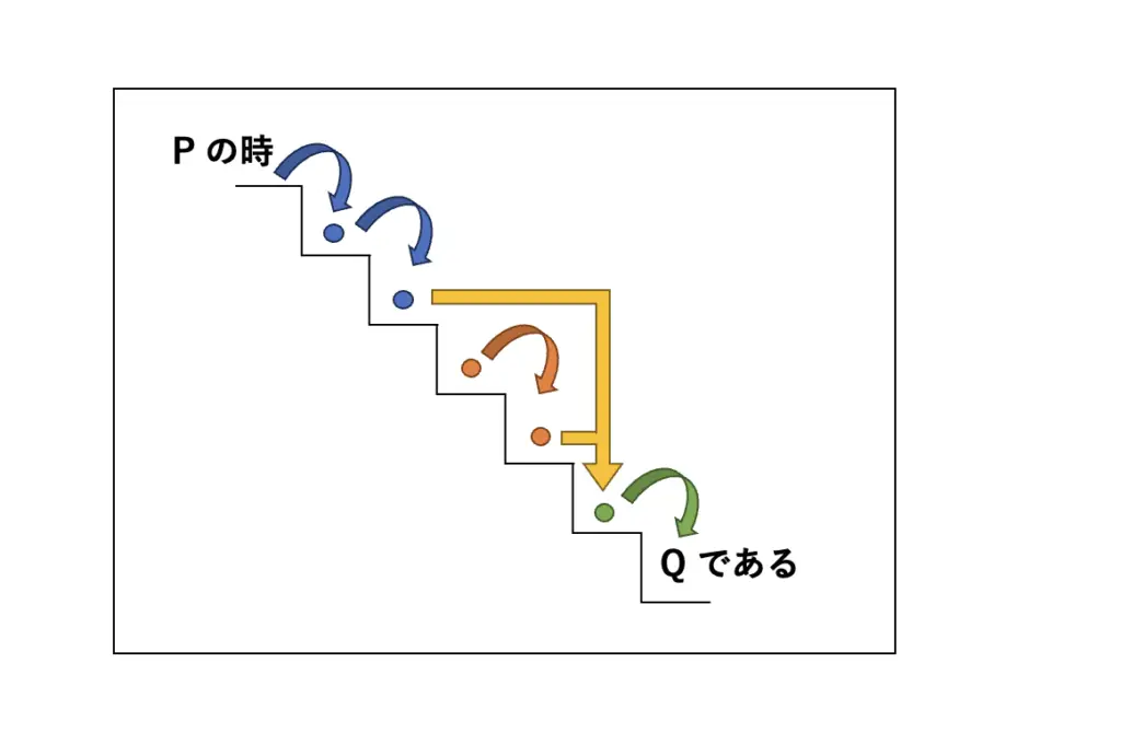 証明とは、「$p \Rightarrow q$」までの一連の流れのこと。