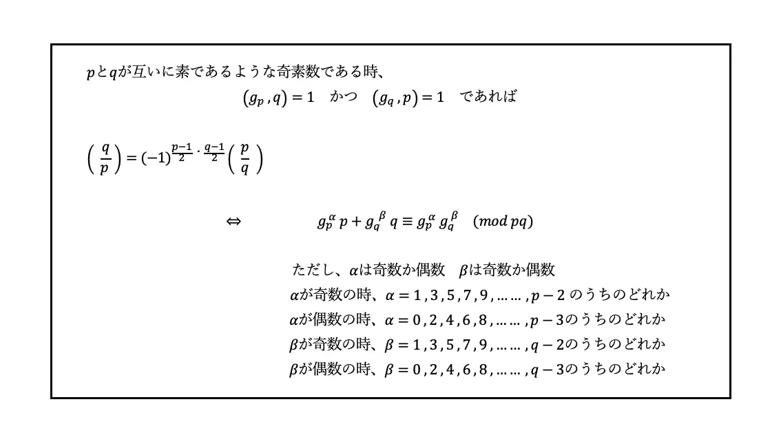 $\Big( \cfrac{q}{p} \Big)=(-1)^{\frac{p-1}{2}・\frac{q-1}{2}}\Big( \cfrac{p}{q} \Big)$ __①